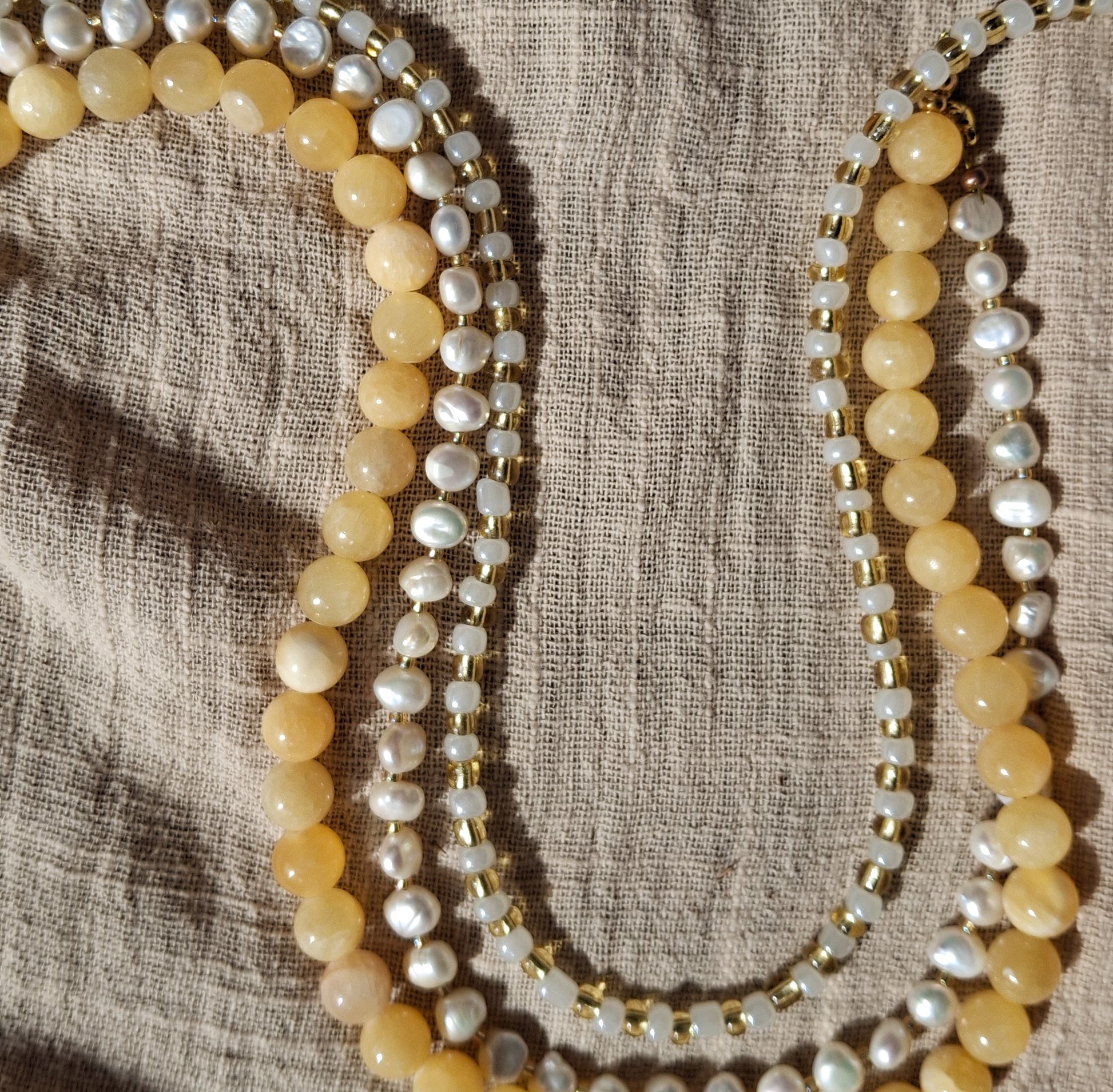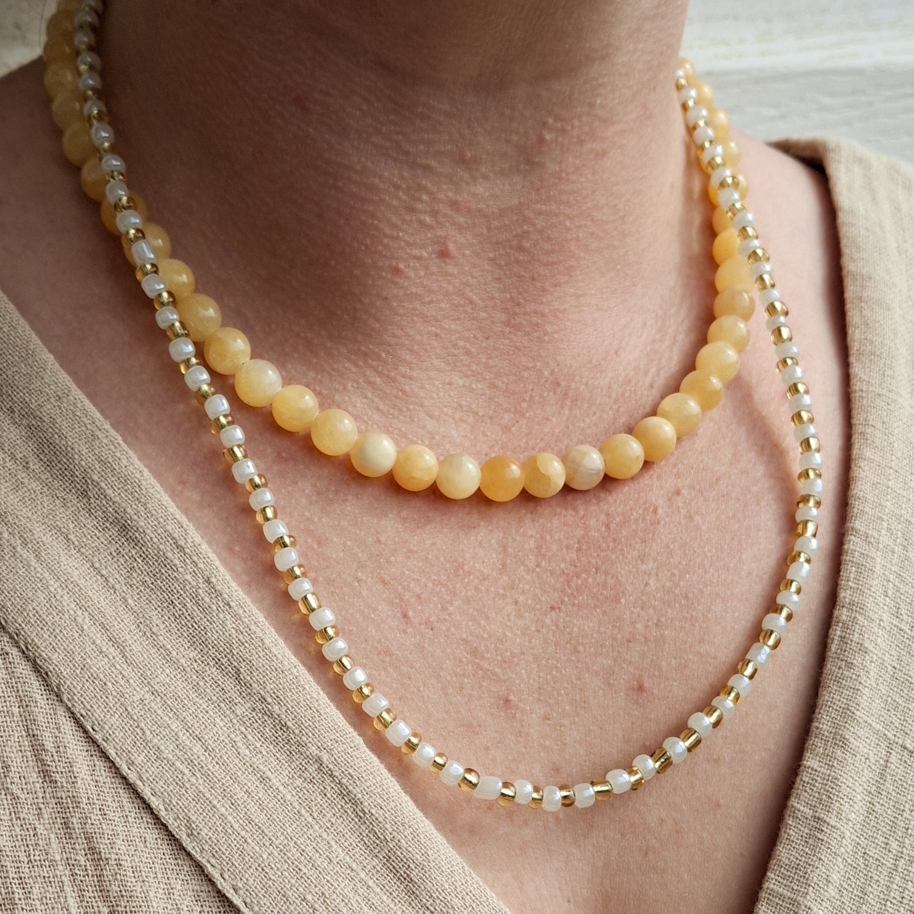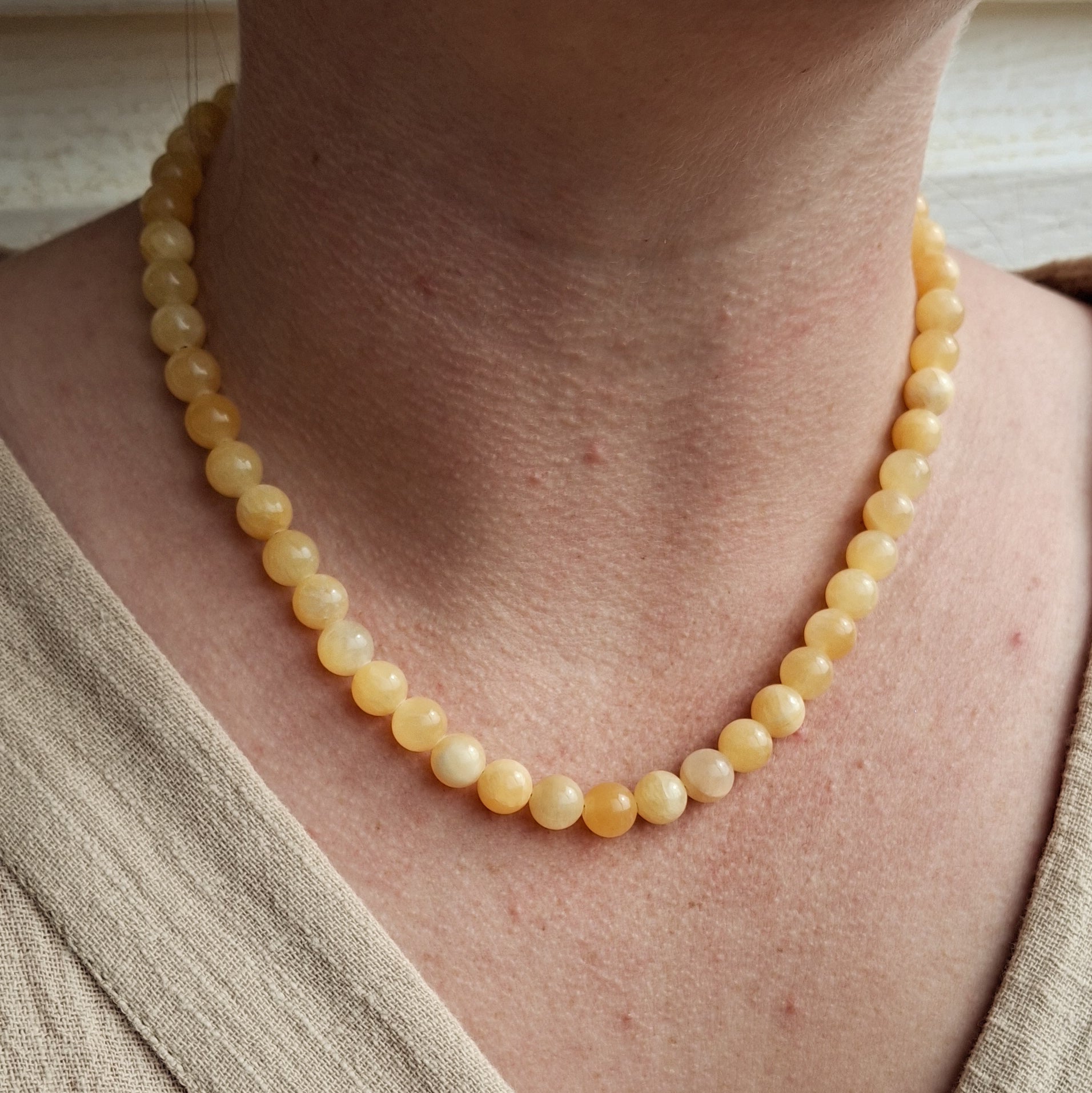 A little bit of sunshine for your day. Sunii, a beautiful handmade necklace crafted from Lemon Chiffon Jade and gold plated hardware. Featuring a magnetic closure for easy wear and versatile styling.