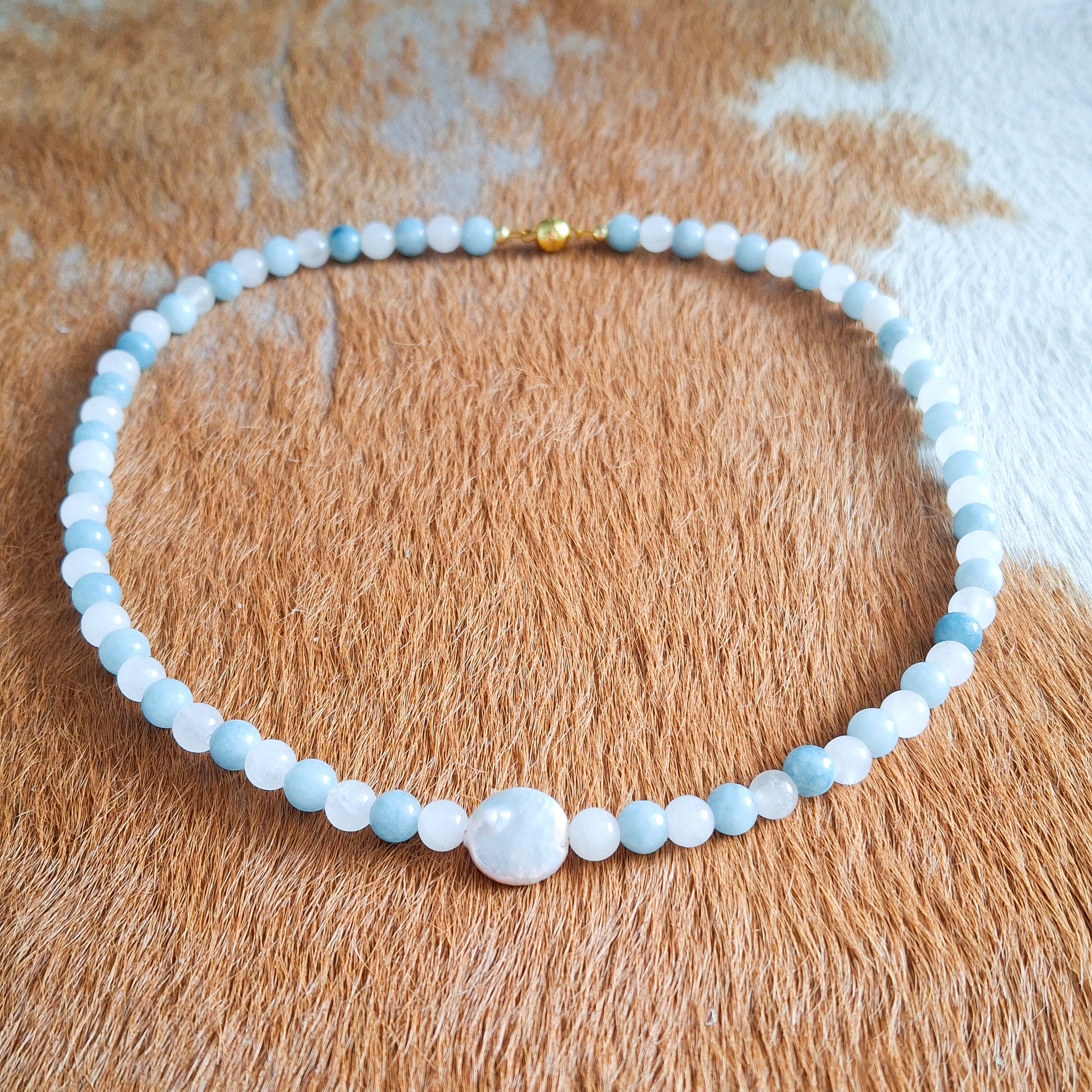 Natural gemstone beads with a freshwater pearl feature. Finishes with gold-plated magnetic hardware. Aprix 42cm