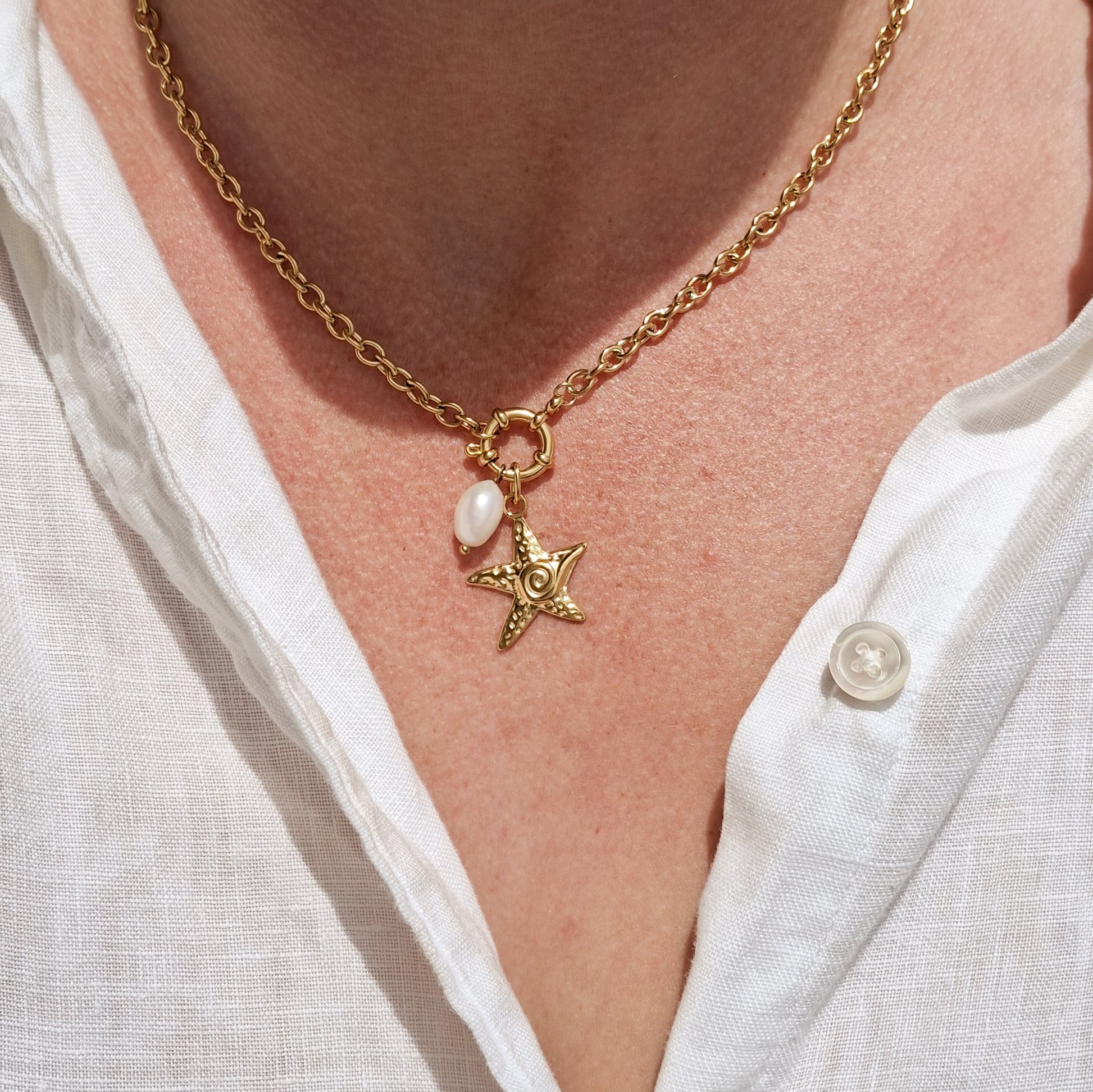 Add a touch of luxury and style to your jewellery collection with this gold plated, tarnish resistant chain. Accented with a stunning freshwater pearl and sparkling star fish, it's an essential piece for any occasion. Upgrade your accessory game today!