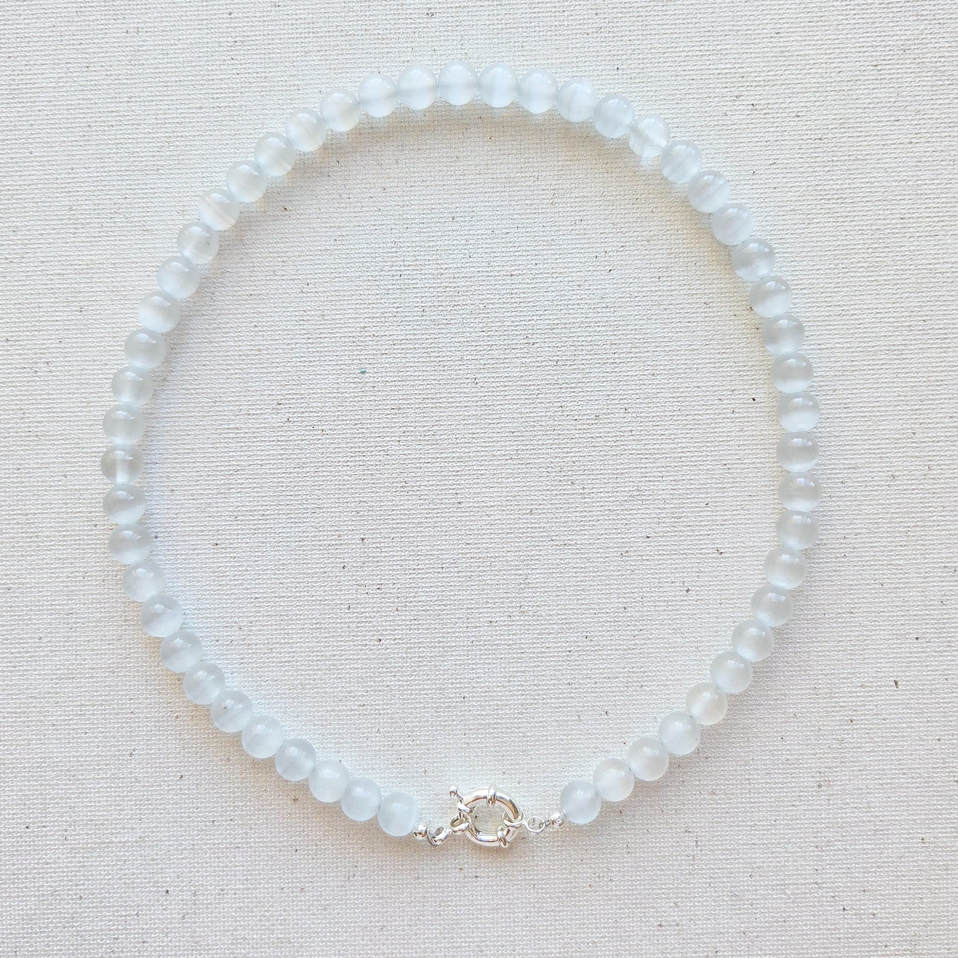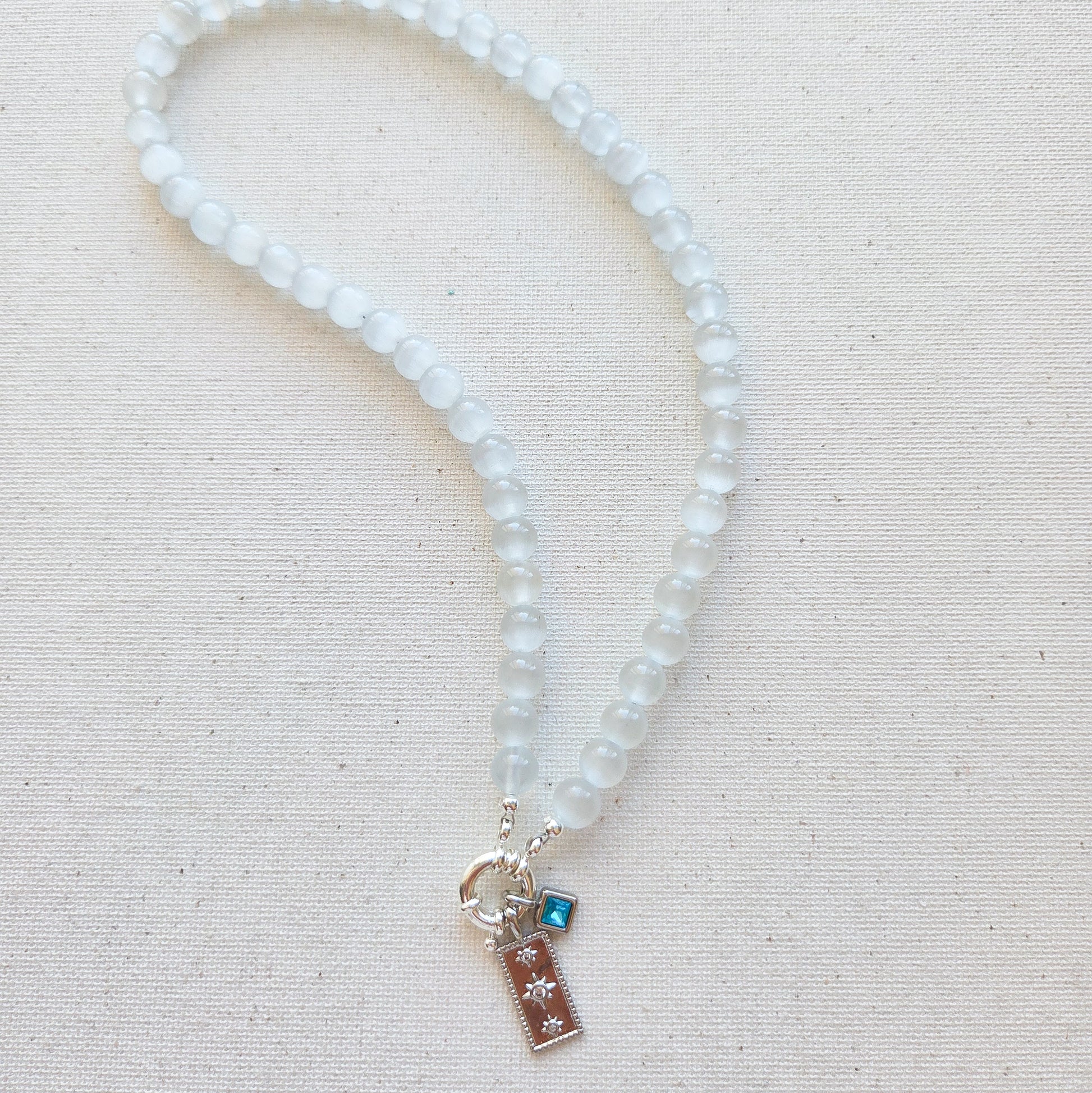 The hardware is tarnish resistant but Selenite isn't a fan of moisture so keep dry. 42cm, hand made in W.A. Natural variations are to be expected with gemstones.